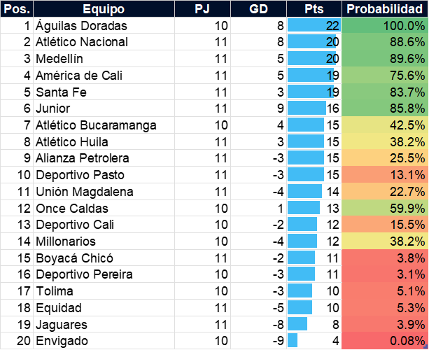 Terminada la fecha 11 (a falta de dos partidos), se presenta un análisis detallado de las probabilidades de los equipos para clasificar entre los 8 primeros al finalizar el torneo "todos contra todos" en la Liga Betplay. Estas probabilidades se calculan considerando múltiples factores que influyen en el rendimiento de cada equipo.